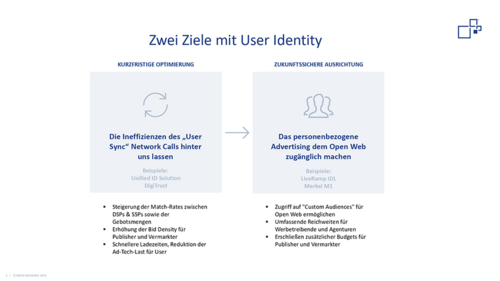 Ein Ansatz bilden User Identity-Lösungen, die sowohl auf der Publisher- als auch auf der Buyer-Seite durch nicht nur cookie-basiertes Targeting, sondern vor allem durch exaktes Zielgruppen-Targeting dem Werbetreibenden ermöglichen, relevante Usergruppen mit personalisiertem Inhalt gezielt anzusprechen und zu erreichen. Durch User Identity soll dem Open Web sowohl ein personenbezogenes Advertising zugänglich gemacht, als auch Ineffizienzen des User-Sync Network Calls behoben werden. Alle Marktteilnehmer im Open Web streben nach einer möglichst exakten und technisch eindeutigen Identifikation einzelner Konsumenten, denn nur für eine zielgenaue Aussteuerung ihrer Werbung sind Werbetreibende auch bereit, mehr Geld in Form von höheren Geboten im Bieterprozess zu investieren.